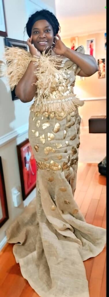 Porter haut les symboles de sa culture : Queen Mbeza, Présidente d’Afiri Ekang Montréal, revêtue d’une robe en fibre de raphia, étoffe ancestrale et distinctive de la noblesse Ekang et Bantoue, Une tenue qui incarne l’élégance, la souveraineté et la fière réaffirmation d’une identité millénaire sur la scène internationale.